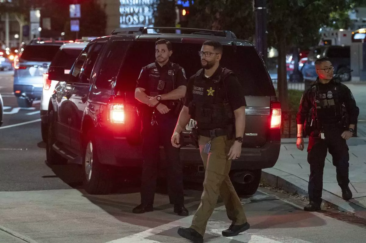 Officer from the Secret Service Uniform Division officers on patrol in the Foggy Bottom neighborhood of Washington, Thursday, Aug. 14, 2025. (AP Photo/Cliff Owen)