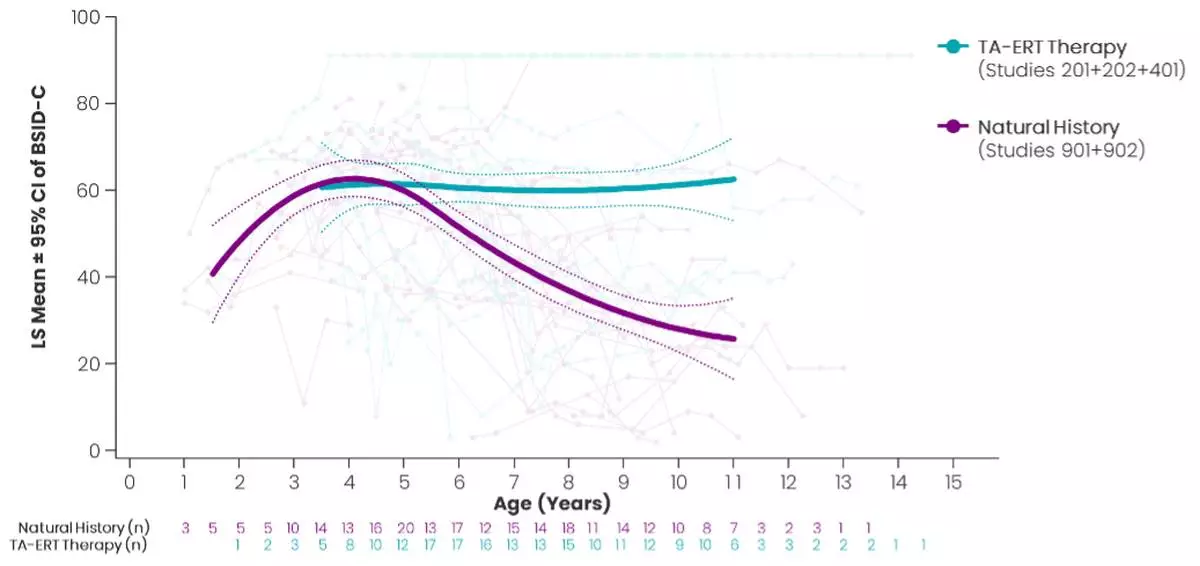 In untreated patients with MPS IIIB, cognitive function peaks at around four years of age and then declines over time. In contrast, children with established disease treated with TA-ERT experienced stable cognitive function over time (Figure 2). Untreated children in the natural history studies showed a decline in cognition beginning at approximately five years of age that progressively worsened over time, while cognition in the TA-ERT treated group remained stable. Using a model-based approach, the mean (95% CI) BSID-C over six to 10 years of age was significantly higher in patients treated with TA-ERT, relative to untreated, age-matched children, with differences evident at six years of age (group difference: 10.67, 95% CI: 3.23, 18.11; p=0.005). At 10 years of age, the difference in BSID-C scores between groups increased to 34.66 (95% CI: 24.38, 44.93; p<0.0001). Although TA-ERT treatment stabilized BSID-C scores on average, increases in BSID-C scores were more commonly observed in subjects who initiated therapy at younger ages with higher baseline cognitive function and prior to the establishment of meaningful neurodegeneration. The BSID-C is anticipated to be the primary endpoint for the post-marketing clinical trial.