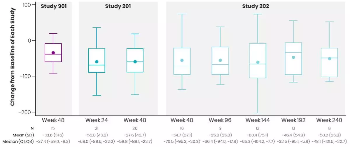 TA-ERT therapy was also associated with stabilization of CGMV, relative to the decline in CGMV observed in untreated children due to the progressive neurodegenerative nature of MPS IIIB (Figure 3). While CGMV should increase with age in children up to five years of age, there was an average loss of ~32 mL over 48 weeks in untreated children with MPS IIIB observed in study 901. Consistent with TA-ERT’s mechanism of action, decreases in CGMV were observed during the initial 24 weeks of TA-ERT treatment, likely reflecting intracellular clearance of cerebral spinal fluid heparan sulfate (CSF HS) and CSF HS-NRE. CGMV stabilized from weeks 48 to 240 with TA-ERT treatment.