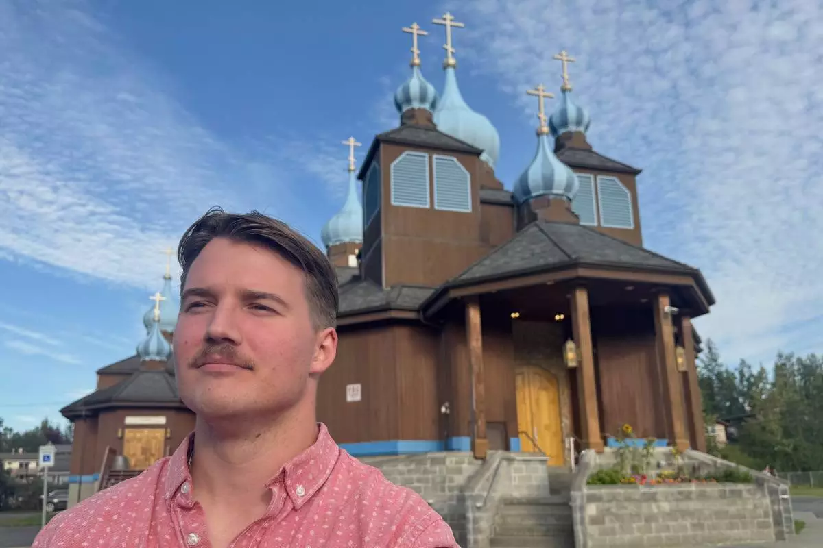 Mark Kalashnikov, a native of Russia living in the United States, poses for a photo outside St. Innocent Orthodox Cathedral on Aug. 12, 2025, in Anchorage, Alaska. (AP Photo/Mark Thiessen)