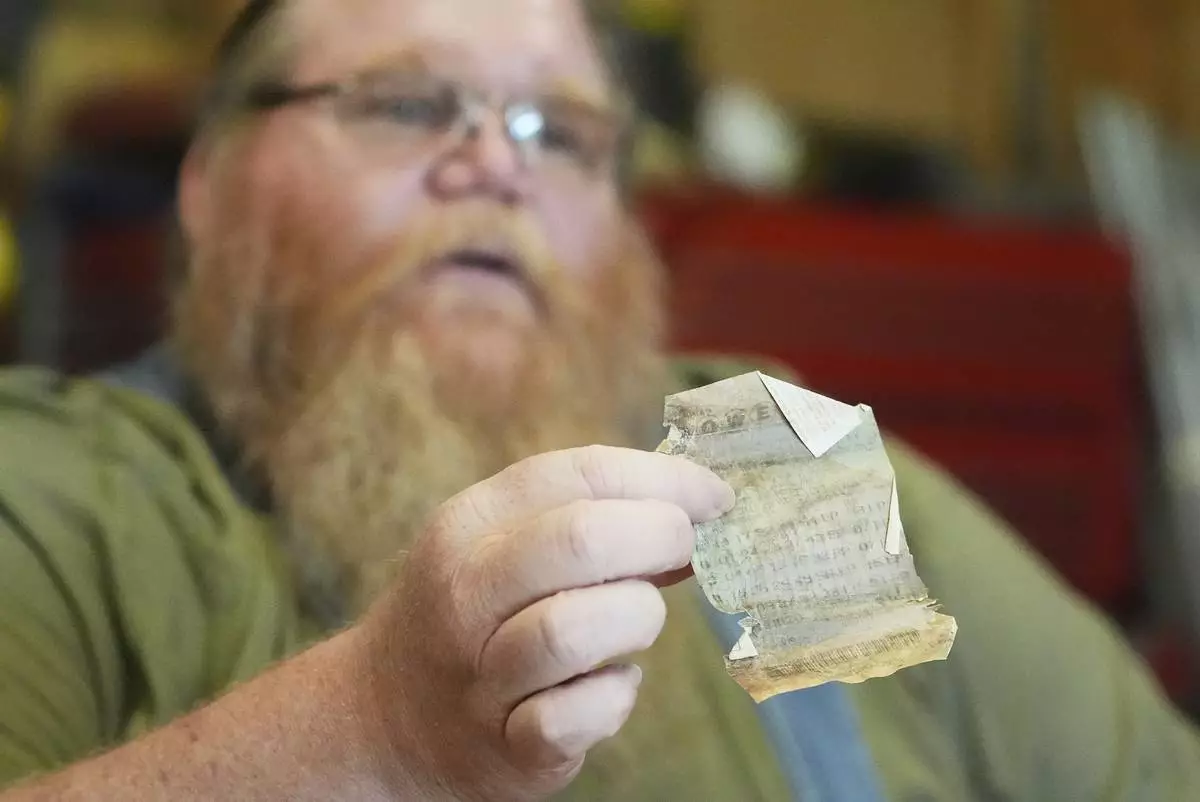 The old wallet of Richard Guilford is seen as he speaks during an interview Thursday, Aug. 14, 2025, in Petersburg, Mich. (AP Photo/Ryan Sun)