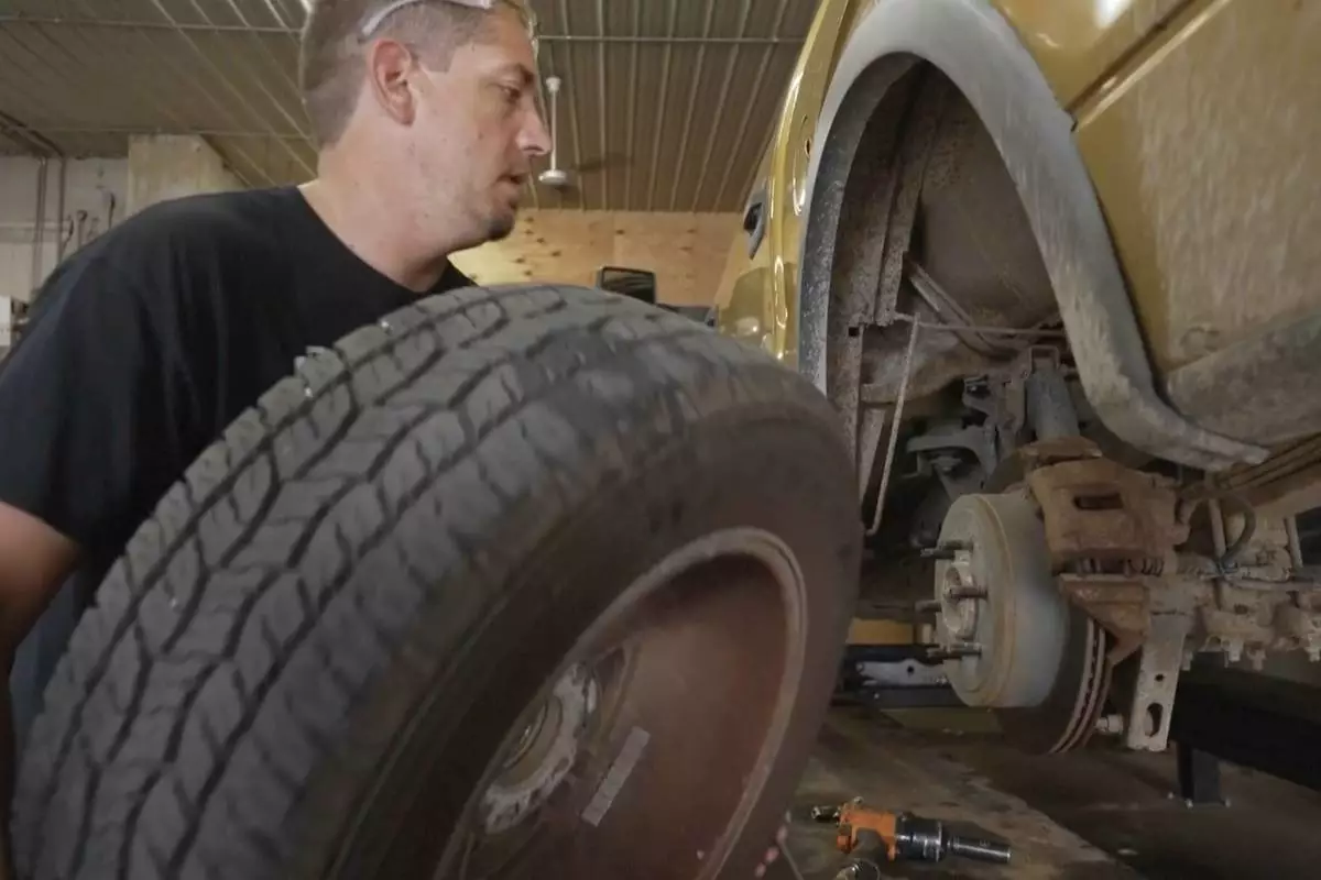 Mechanic Chad Volk works on a vehicle in his shop in Lake Crystal, Minn., on Aug. 14 2025. (AP Photo/Mark Vancleave)
