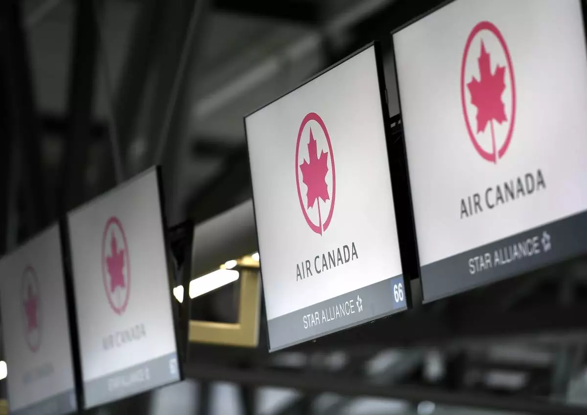 FILE - This May 16, 2020 file photo shows Air Canada check screens at Ottawa International Airport in Ottawa, Ontario, Canada. (Justin Tang/The Canadian Press via AP, File)