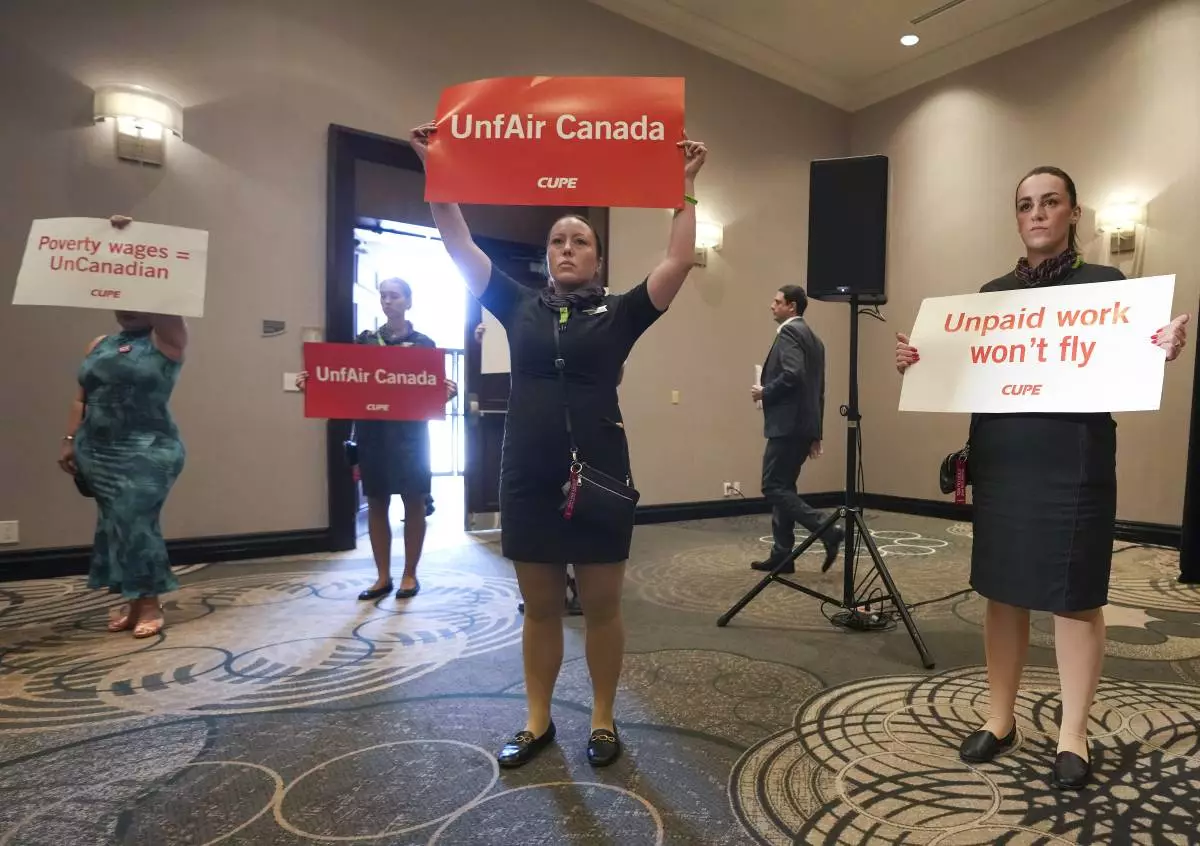 Air Canada flight attendants interrupt Air Canada executives during a press conference as a possible strike looms in Toronto on Thursday, August 14, 2025. (Nathan Denette/The Canadian Press via AP)
