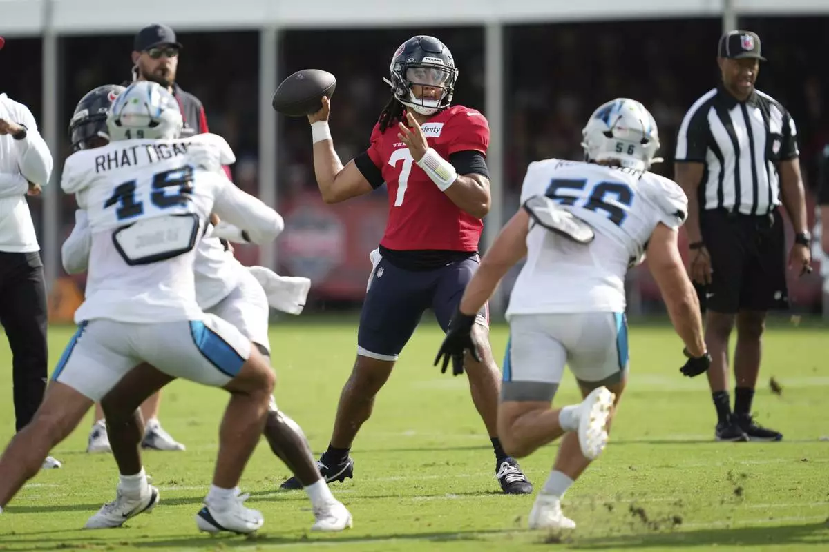 Houston Texans quarterback C.J. Stroud (7) throws during a joint NFL football practice with the Carolina Panthers Thursday, Aug. 14, 2025, in Houston. (AP Photo/Ashley Landis)