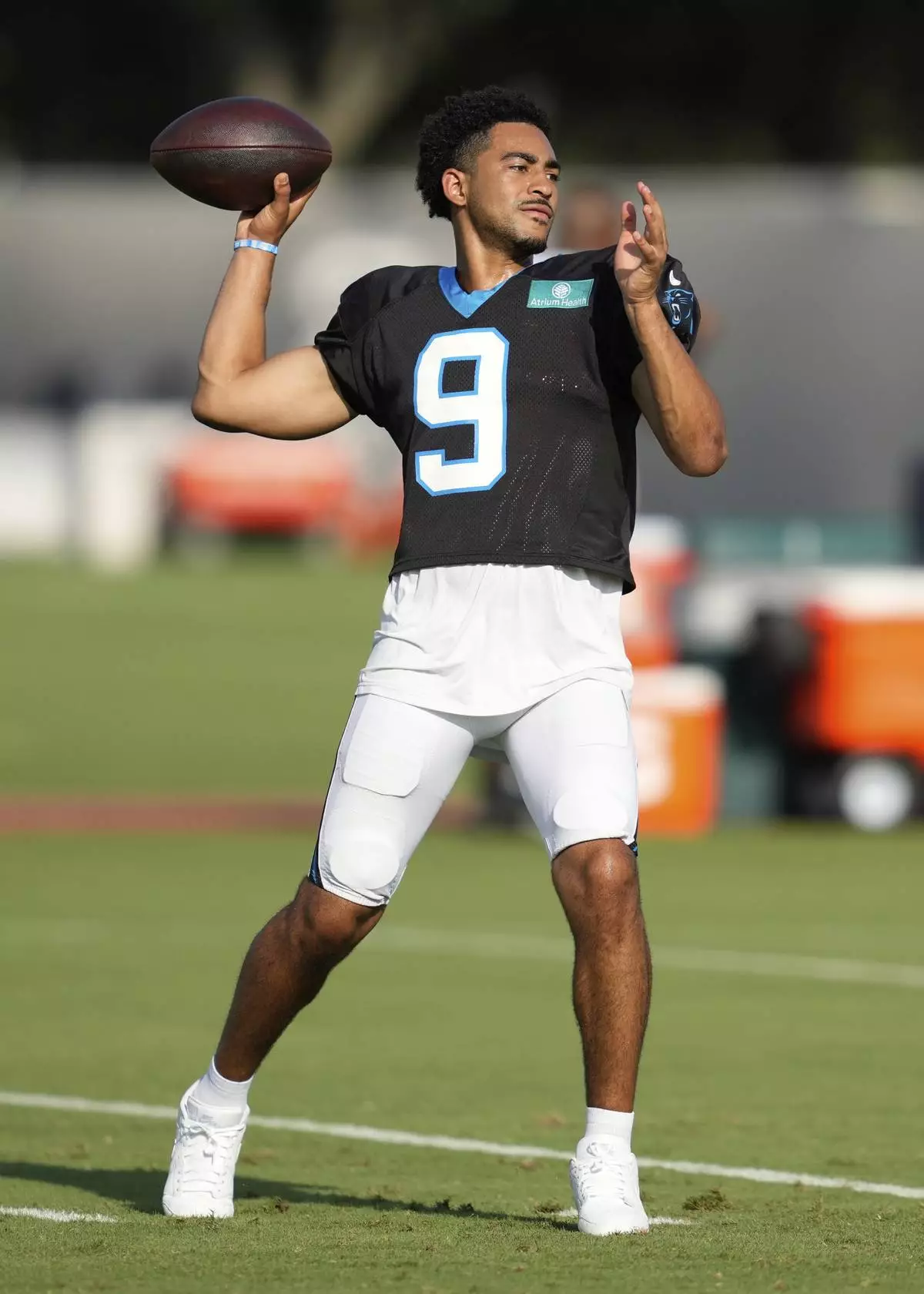 Carolina Panthers quarterback Bryce Young works out during a joint NFL football practice with the Houston Texans Thursday, Aug. 14, 2025, in Houston. (AP Photo/Ashley Landis)