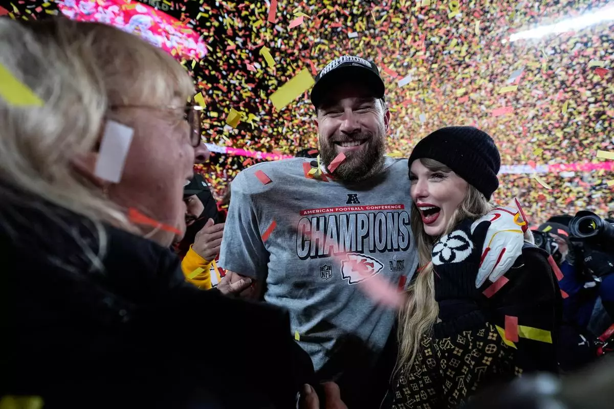 FILE - Donna Kelce stands with her son Kansas City Chiefs tight end Travis Kelce and Taylor Swift after the AFC Championship NFL football game against the Buffalo Bills, Jan. 26, 2025, in Kansas City, Mo. (AP Photo/Ashley Landis, File)