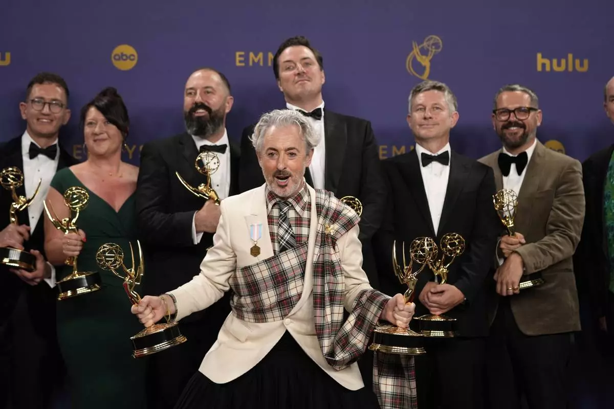 FILE - Alan Cumming, center, and the team from "The Traitors" pose in the press room with the award for outstanding reality competition program during the 76th Primetime Emmy Awards, Sept. 15, 2024, at the Peacock Theater in Los Angeles. (AP Photo/Jae C. Hong, File)