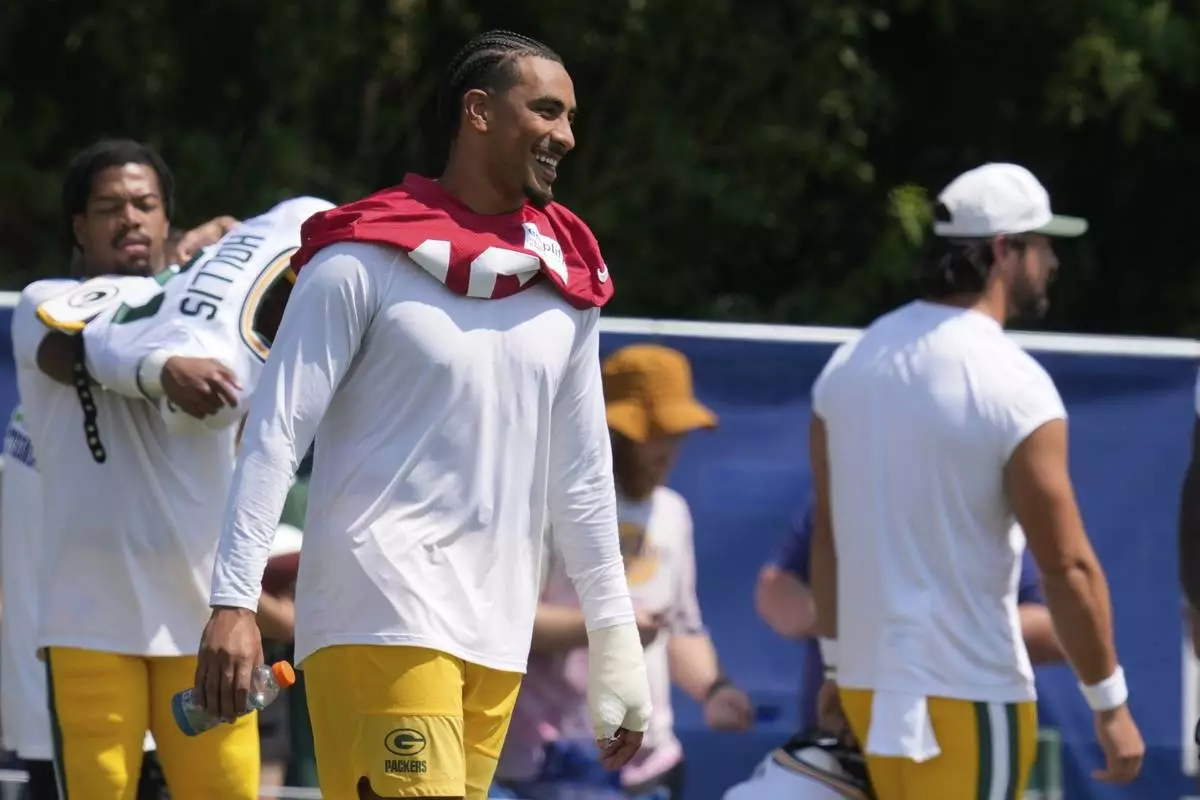 Green Bay Packers quarterback Jordan Love watches during an NFL football joint training camp with the Indianapolis Colts, Thursday, Aug. 14, 2025, in Westfield, Westfield, Ind. (AP Photo/Darron Cummings)
