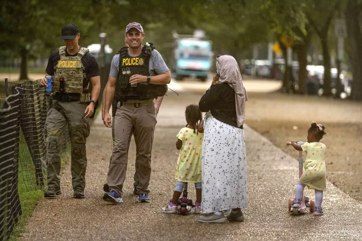 A woman and children watch as officers with the Drug Enforcement Administration patrol along the National Mall Wednesday, Aug. 13, 2025, in Washington. (AP Photo/Mark Schiefelbein)