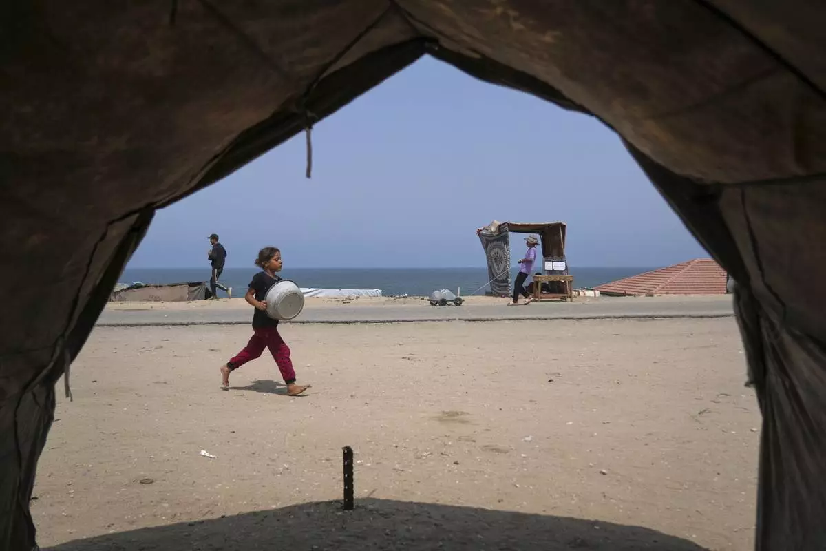 A Palestinian girl runs with an empty basin to a water distribution point during a hot summer day with temperatures reaching 36 °C (97 °F) in Deir al-Balah, in the central Gaza Strip, Wednesday, Aug. 13, 2025. The youth behind her pulls containers of water. (AP Photo/Abdel Kareem Hana)