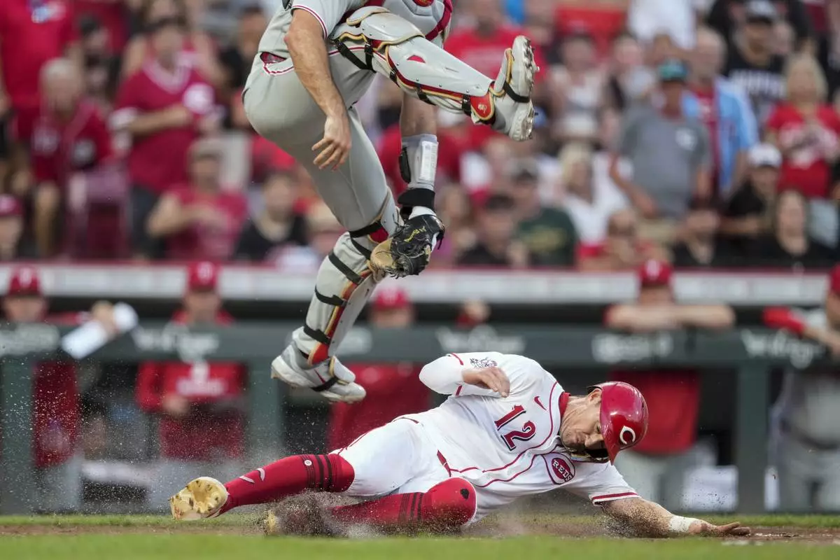 Cincinnati Reds' Austin Hays slides safe at home under leaping Philadelphia Phillies catcher J.T. Realmuto on a single hit by Noelvi Marte during the sixth inning of a baseball game Wednesday, Aug. 13, 2025, in Cincinnati. (AP Photo/Carolyn Kaster)