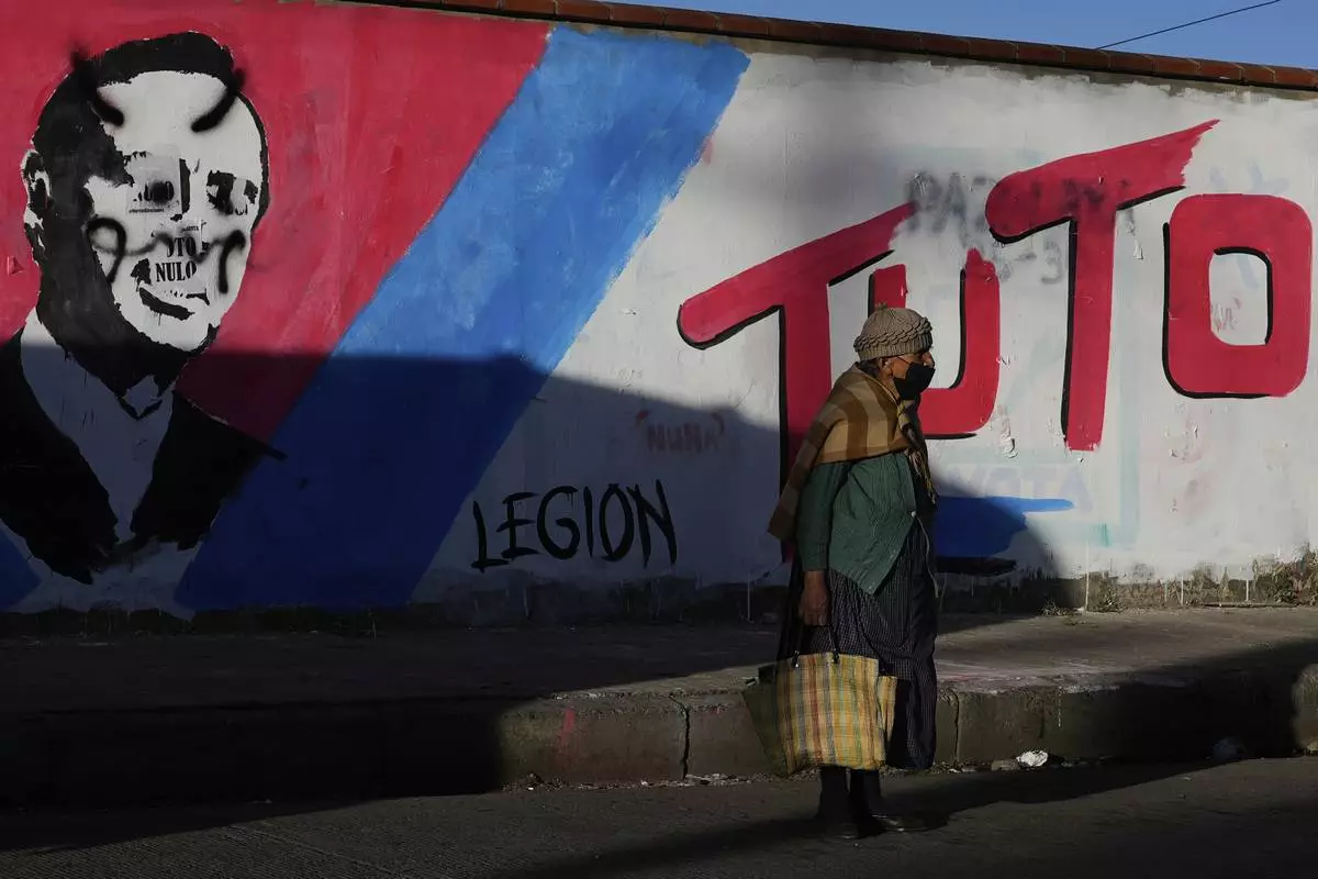 A woman stands in front of a defaced mural promoting presidential candidate Jorge "Tuto" Quiroga of the Alianza Libre political party, in El Alto, Bolivia, Saturday, Aug. 9, 2025. (AP Photo/Juan Karita)