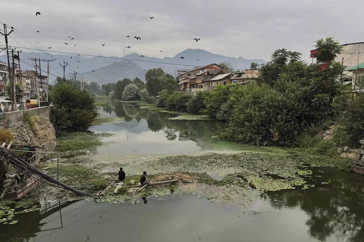 People fish in a polluted water canal in Srinagar, Indian-controlled Kashmir, Thursday, Aug. 14, 2025. (AP Photo/Mukhtar Khan)