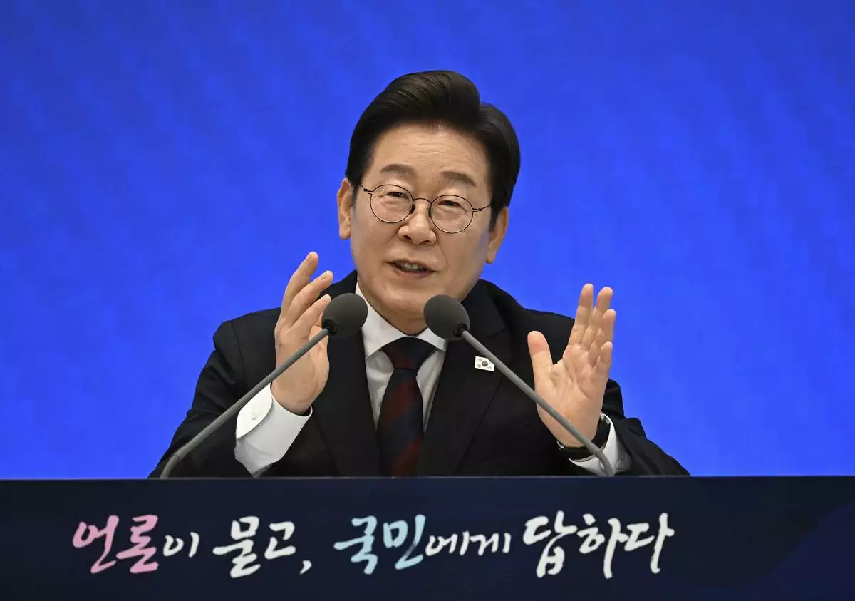 FILE - South Korean President Lee Jae Myung delivers a speech during a news conference to mark his first 30 days in office at Yeongbingwan of Blue House in Seoul, South Korea, July 3, 2025. (Kim Min-Hee/Kyodo News via AP, Pool, File)