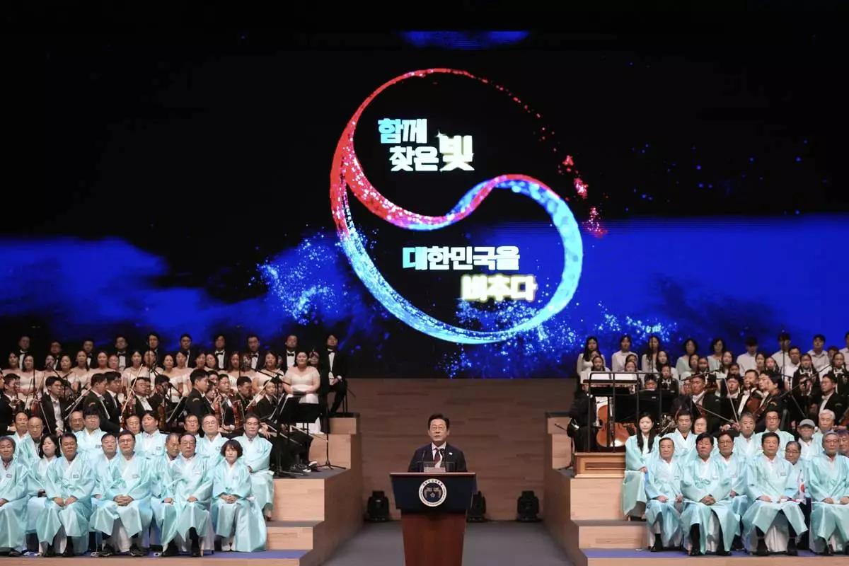 South Korean President Lee Jae Myung speaks during a ceremony to celebrate the 80th anniversary of Korea's liberation from Japanese colonial rule in Seoul, South Korea, Friday, Aug. 15, 2025. (AP Photo/Ahn Young-joon, Pool)