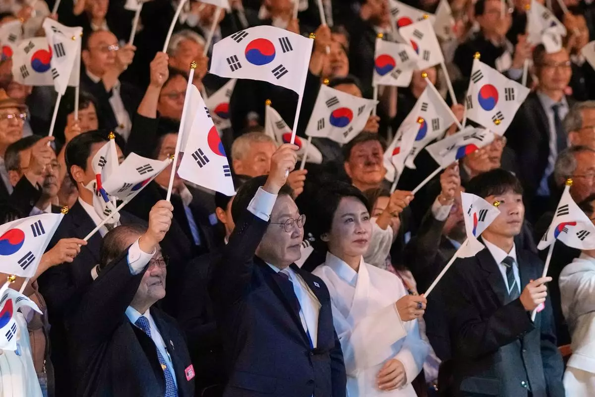 South Korean President Lee Jae Myung, center left, and his wife Kim Hea Kyung, center right, wave the national flags during the 80th anniversary of Korea's liberation from Japanese colonial rule in Seoul, South Korea, Friday, Aug. 15, 2025. (AP Photo/Ahn Young-joon, Pool)