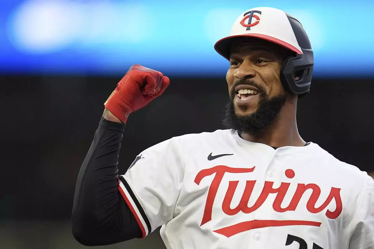 Minnesota Twins' Byron Buxton (25) reacts after hitting a single during the third inning of a baseball game against the Detroit Tigers Thursday, Aug. 14, 2025, in Minneapolis. (AP Photo/Abbie Parr)