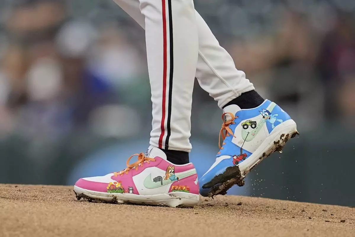 The cleats worn by Minnesota Twins starting pitcher Bailey Ober (17) are pictured during the first inning of a baseball game against the Detroit Tigers Thursday, Aug. 14, 2025, in Minneapolis. (AP Photo/Abbie Parr)