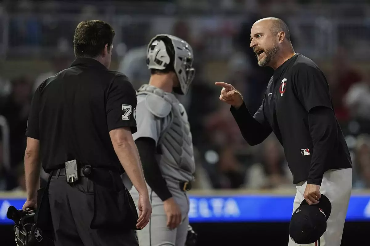 Minnesota Twins manager Rocco Baldelli, right, reacts toward home umpire John Bacon, left, after being ejected during the 11th inning of a baseball game against the Detroit Tigers, Thursday, Aug. 14, 2025, in Minneapolis. (AP Photo/Abbie Parr)