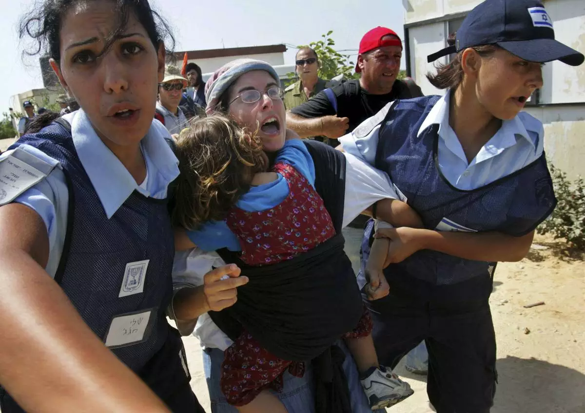 FILE - Israeli security forces carry a resisting settler, with her daughter clinging on, to a waiting bus as settlers are evacuated, Aug. 17, 2005 from the Kerem Atzmona settlement in the Gaza Strip. (AP Photo/David Silverman, Pool, File)
