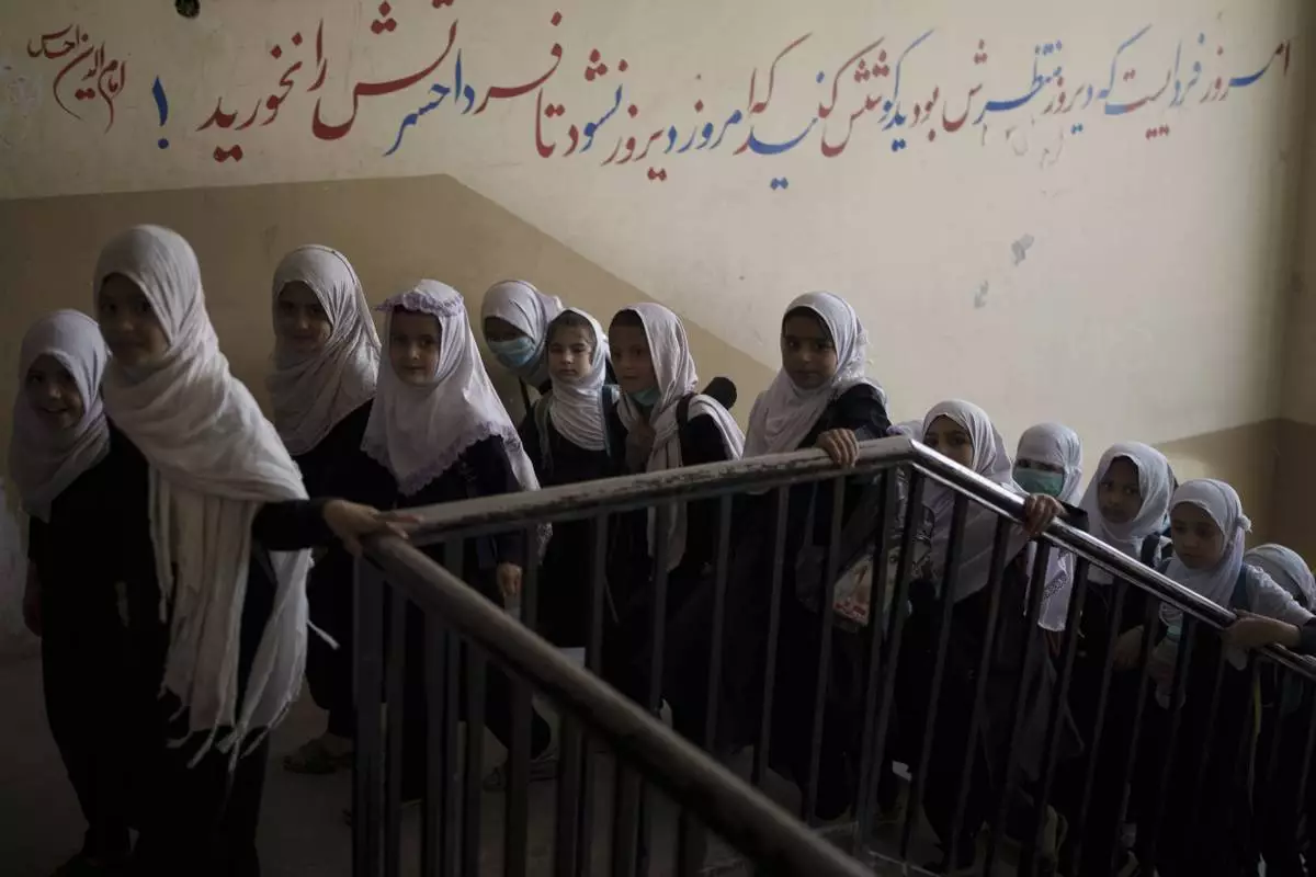 FILE - Girls walk upstairs as they enter a school before class in Kabul, Afghanistan, Sunday, Sept. 12, 2021. (AP Photo/Felipe Dana, File)