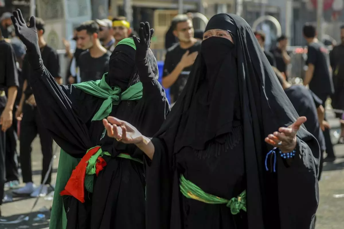 Shiite pilgrims women pray during Arbaeen, which marks the end of the 40-day mourning period following Ashoura, in Karbala, Iraq, Thursday, Aug. 14, 2025. (AP Photo/Ammar Khalil)