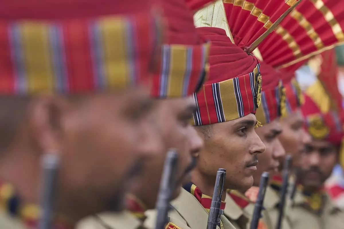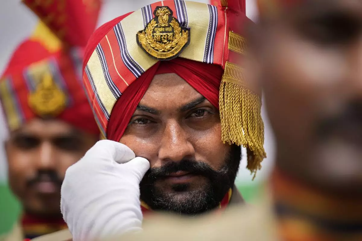 A Sikh paramilitary person adjusts his moustache before taking part in a parade during the country's Independence Day celebrations in Guwahati, India, Friday, Aug. 15, 2025. (AP Photo/Anupam Nath)