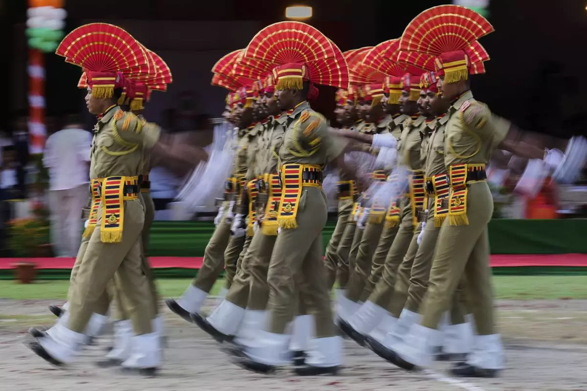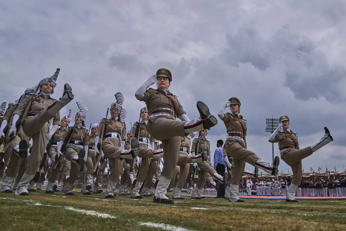 Assam Police personnel rest after a parade during the country's Independence Day celebrations in Guwahati, Friday, Aug. 15, 2025. (AP Photo/Anupam Nath)