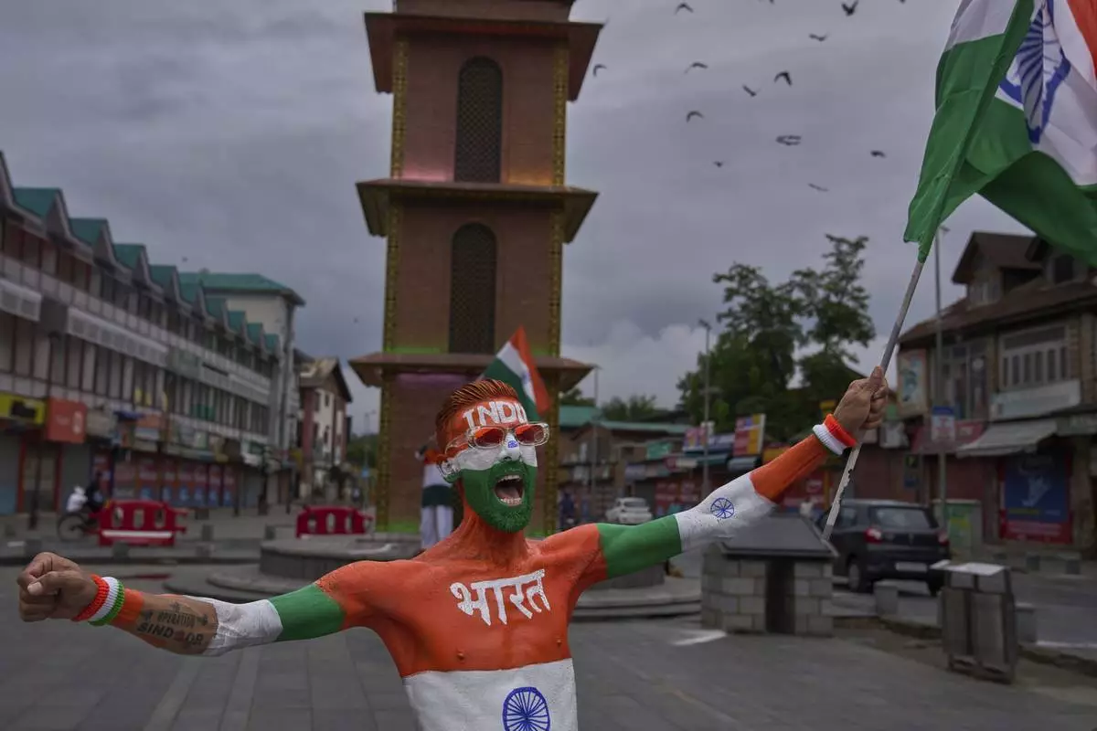An Indian man painted with the Indian national flag shouts slogans as he celebrates India's Independence Day in Srinagar, Indian controlled Kashmir, Friday, Aug. 15, 2025. (AP Photo/Dar Yasin)