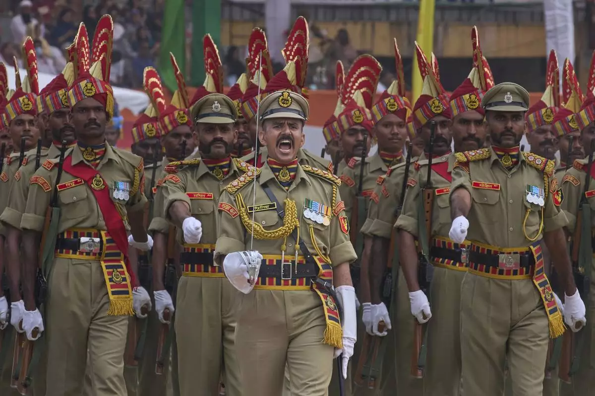 Indian Army's Bihar Regiment marches past in ceremonial attire during the country's Independence Day celebrations in Kolkata, India, Friday, Aug. 15, 2025. (AP Photo/Bikas Das)