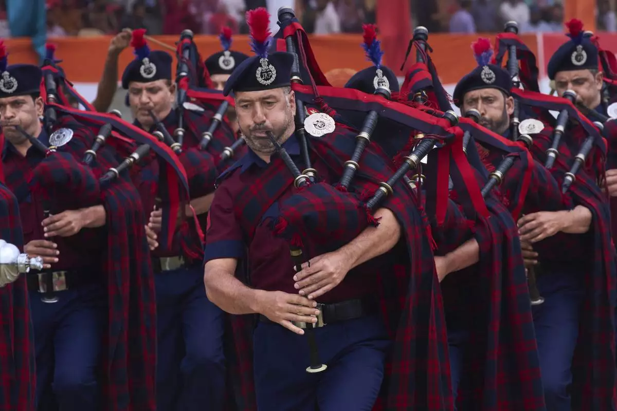 Bagpipers from Jammu Kashmir Police perform during India's Independence Day celebrations in Srinagar, Indian controlled Kashmir, Friday, Aug. 15, 2025. (AP Photo/Dar Yasin)