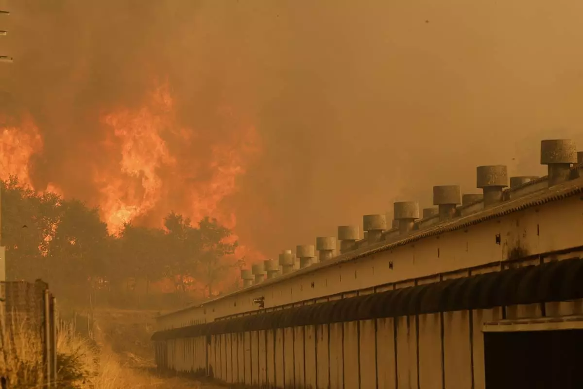 A fire approaches a farm during a wildfire in Santa Baia De Montes, northwestern Spain, Thursday, Aug. 14, 2025. (AP Photo/Lalo R. Villar)