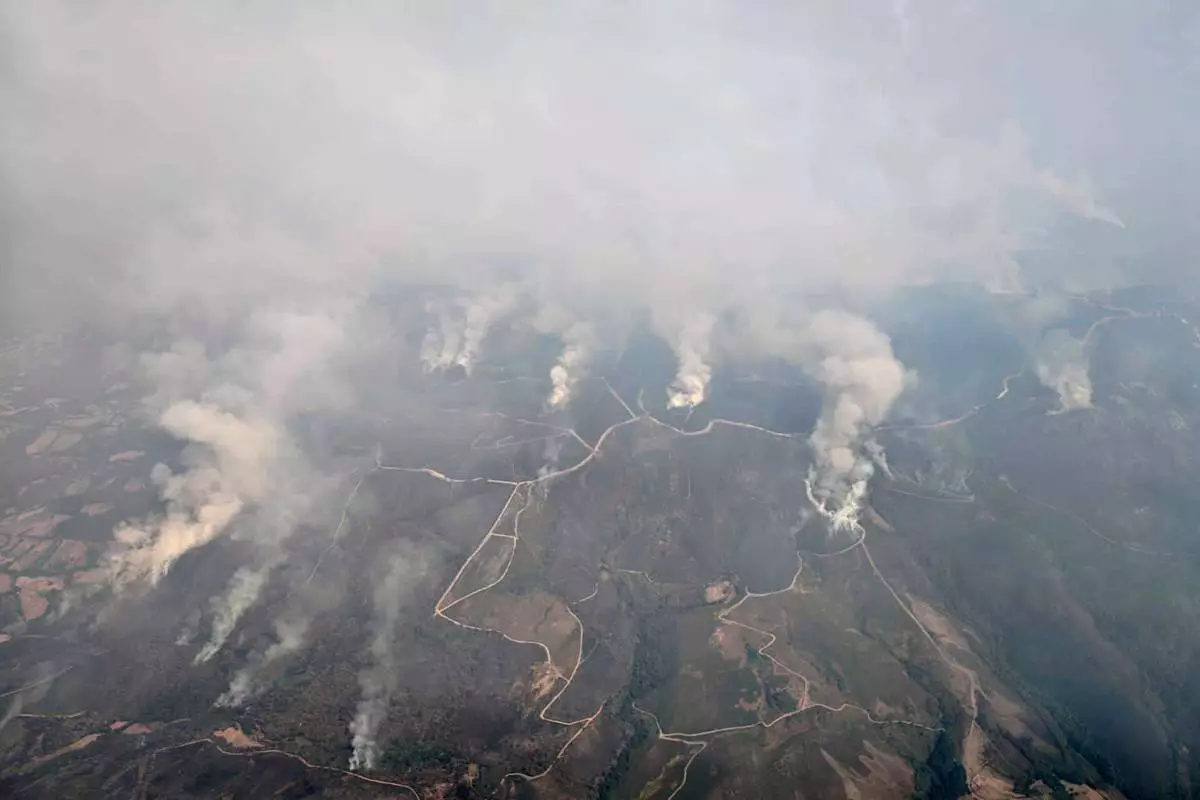 This recent photo taken from a French Canadair water bomber and provided Friday, Aug. 15, 2025 by the Securite Civile shows wildfire in Spain. (Securite Civile via AP)