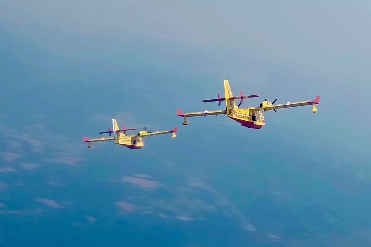 This recent photo provided by the Securite Civile shows two French Canadair water bombers flying over Spain. (Securite Civile via AP)