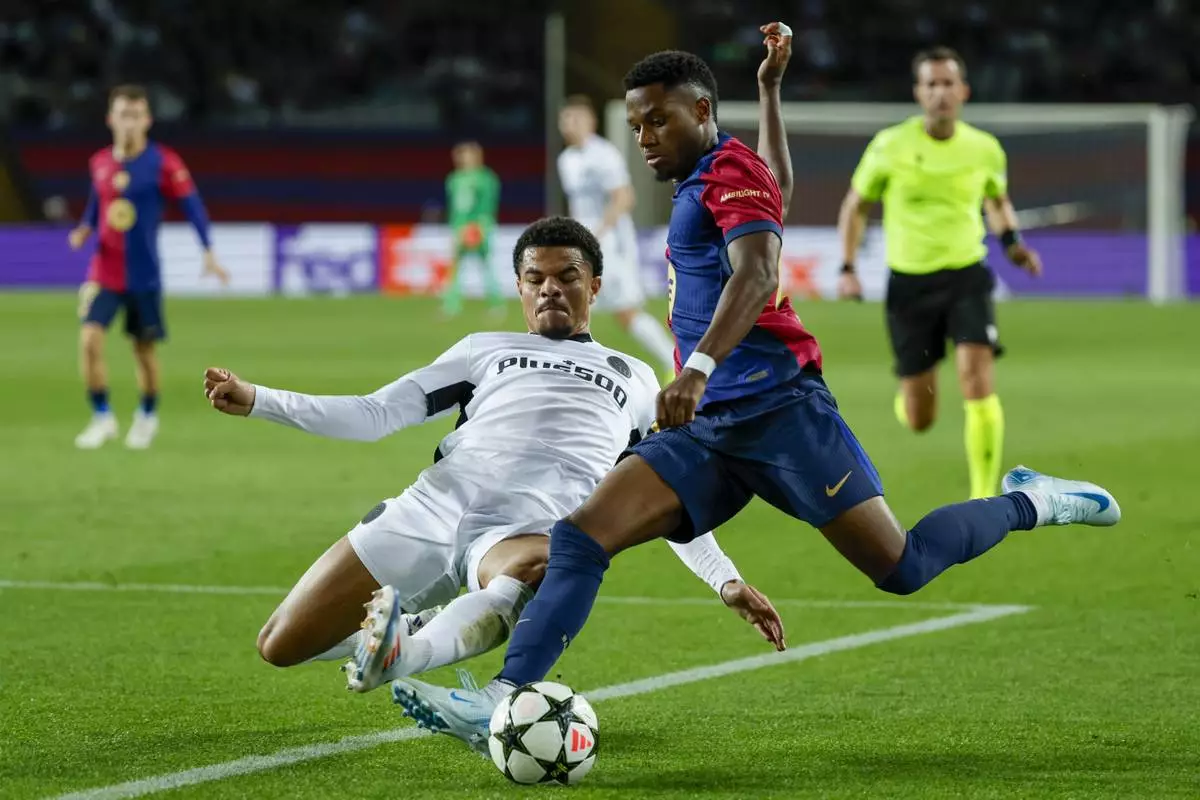 FILE - Barcelona's Ansu Fati, right, is challenged by Young Boys' Zachary Athekame during the Champions League soccer match between Barcelona and Young Boys at the Lluis Companys Olympic Stadium in Barcelona, Spain, Tuesday, Oct. 1, 2024. (AP Photo/Joan Monfort, File)