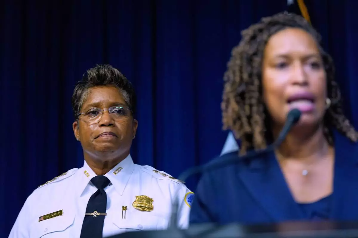 FILE - Metropolitan Police Department Chief Pamela Smith listens as Washington Mayor Muriel Bowser speaks during a news conference on President Donald Trump's plan to place Washington police under federal control and deploy National guard troops to Washington, Aug. 11, 2025, in Washington. (AP Photo/Julia Demaree Nikhinson, File)