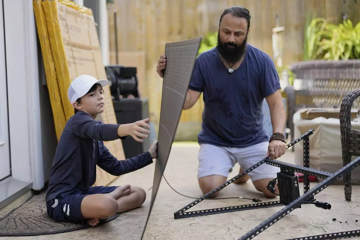Bhavin Misra, right, and his son, Rumi, 10, assemble a Craftstrom Solar plug-in kit at their home Tuesday, Aug. 5, 2025, in Houston. (AP Photo/David J. Phillip)