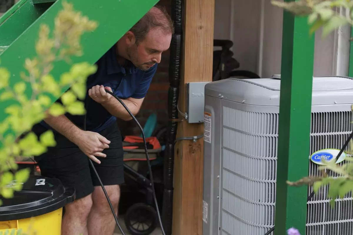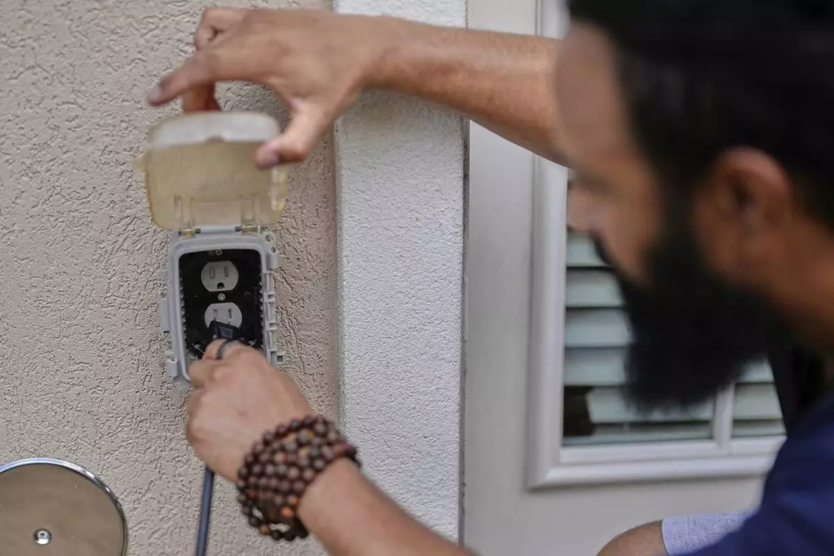 Craig Keenan runs a wire to an outlet after installing a solar panel from Bright Saver on Friday, Aug. 1, 2025, in Baltimore. (AP Photo/KT Kanazawich)