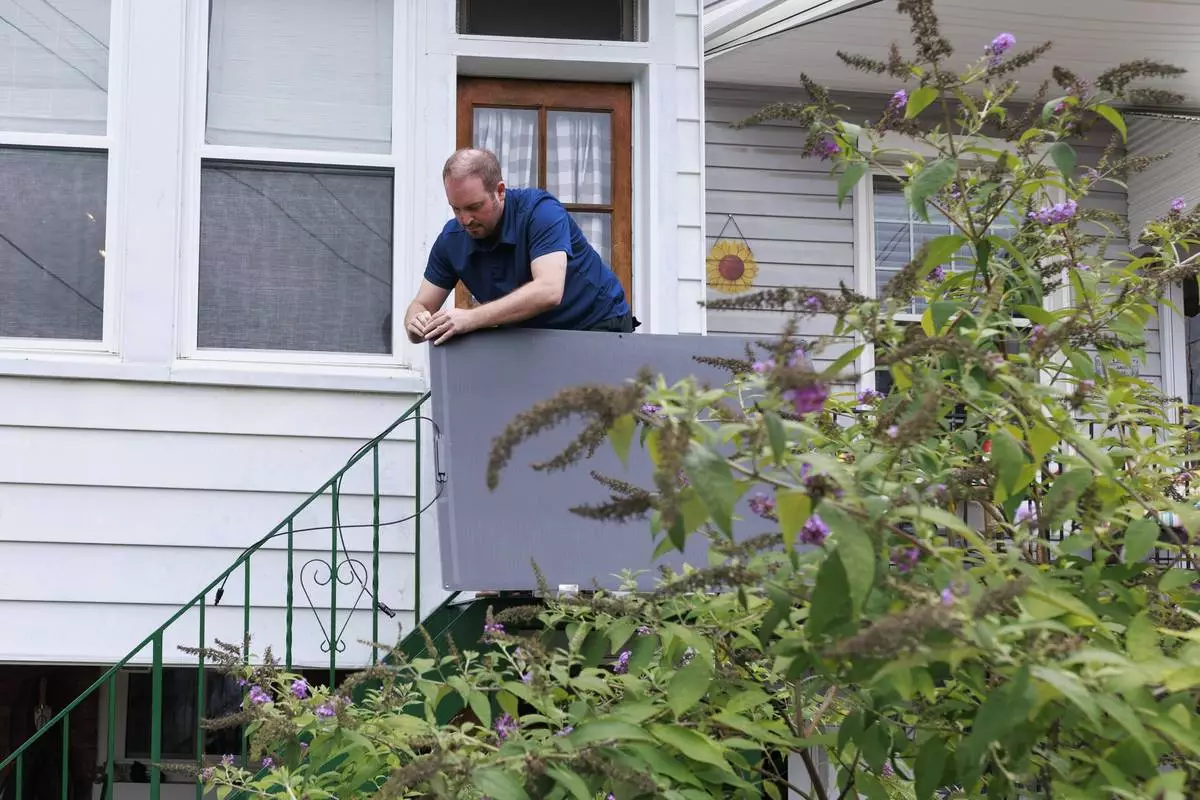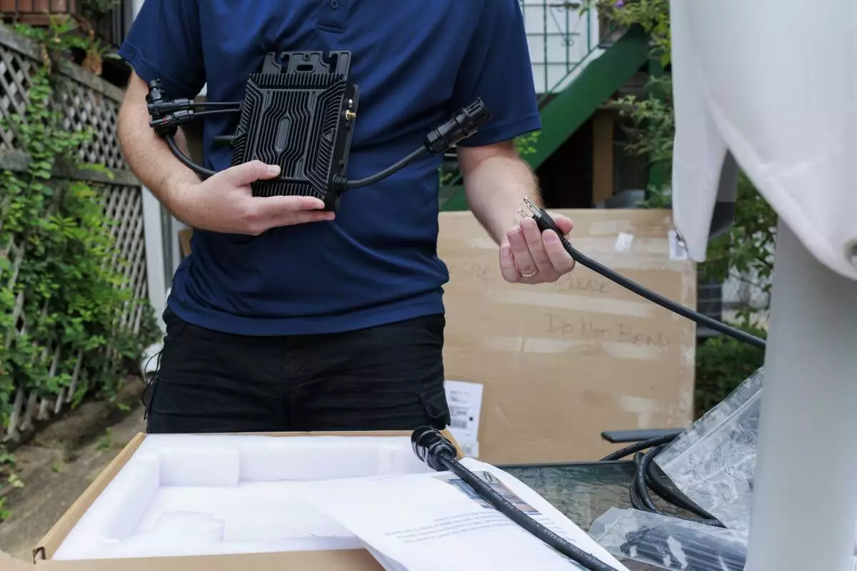 Craig Keenan prepares to install a microinverter with his solar panel from Bright Saver on Friday, Aug. 1, 2025, in Baltimore. (AP Photo/KT Kanazawich)