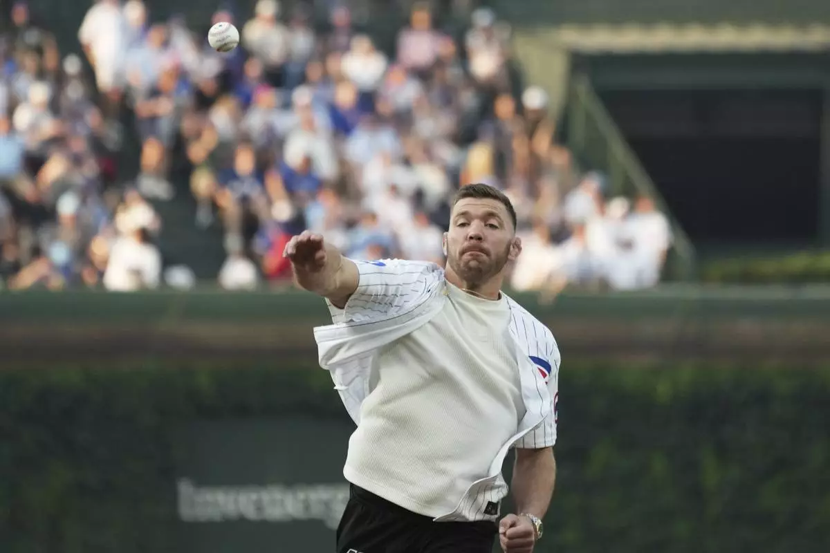 UFC middleweight champion Dricus Du Plessis throws out a ceremonial first pitch before a baseball game between the Cincinnati Reds and the Chicago Cubs in Chicago, Tuesday, Aug. 5, 2025. (AP Photo/Nam Y. Huh)