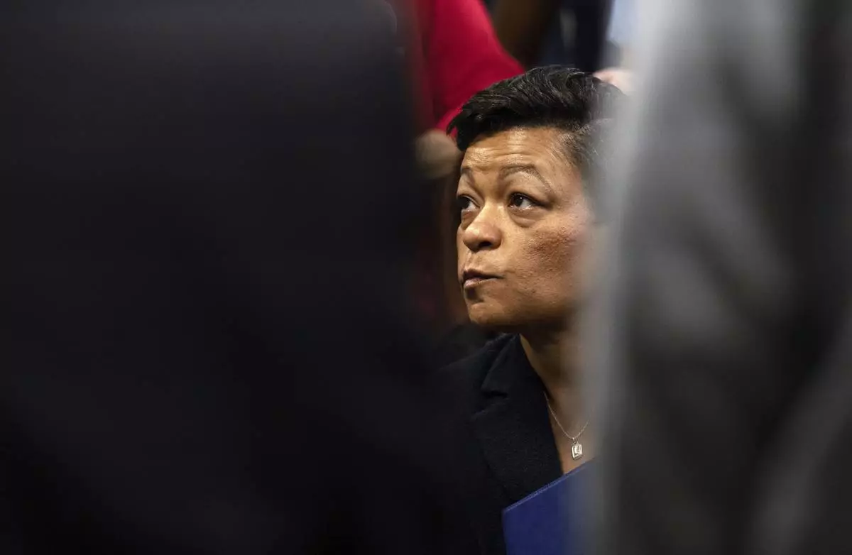 FILE - New Orleans Mayor LaToya Cantrell listens during a meeting after Hurricane Francine at New Orleans International Airport, Sept. 13, 2024, in Kenner, La. (Hilary Scheinuk/The Advocate via AP, Pool, File)