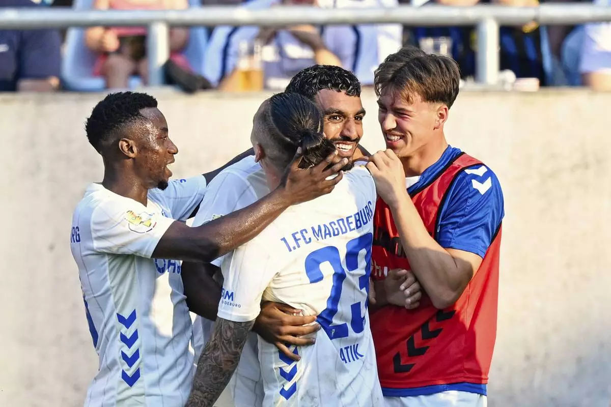 Magdeburg's Rayan Ghrieb, second right, celebrates scoring with teammates during the DFB Cup first round soccer match between FC Saarbrücken and FC Magdeburg at Ludwigspark Stadium in Saarbrücken, Germany, Friday Aug. 15, 2025. (Uwe Anspach/dpa via AP)