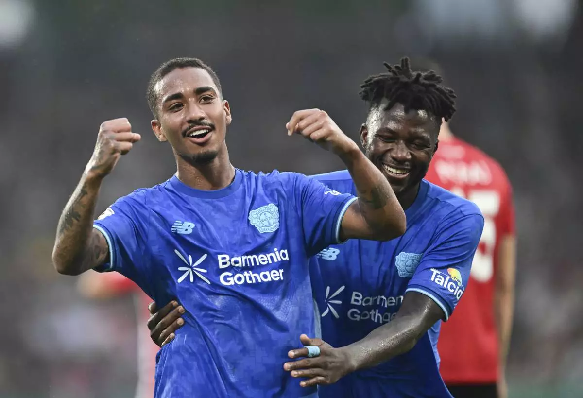 Leverkusen's Arthur celebrates scoring with Edmond Tapsoba, right, during the DFB Cup 1st round soccer match between SG Sonnenhof Großaspach and Bayer Leverkusen at WIRmachenDRUCK Arena, Aspach, Germany, Friday Aug. 15, 2025. (Bernd Weißbrod/dpa via AP)