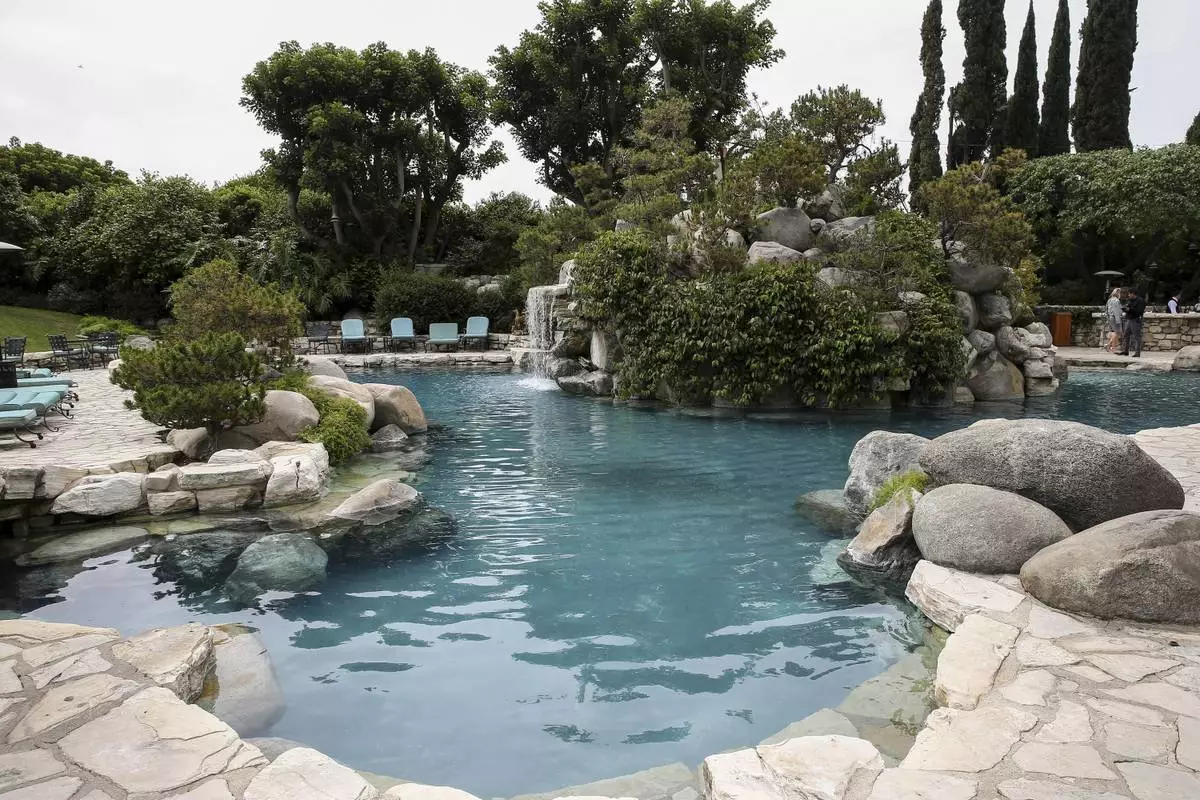 FILE - A waterfall flows into a pool on the grounds at the Playboy Mansion in Los Angeles, May 11, 2016. (Photo by John Salangsang/Invision/AP, File)