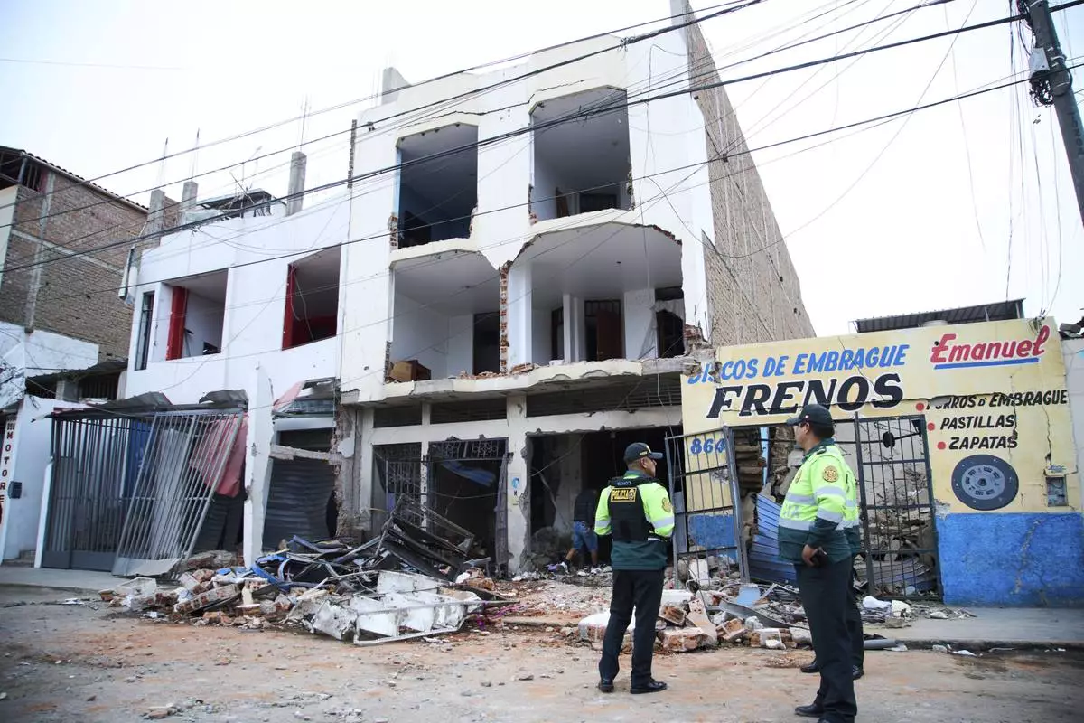 Police stand outside a building damaged by an explosion in Trujillo, Peru, Friday, Aug. 14, 2025. (AP Photo/Gabriel Romero)