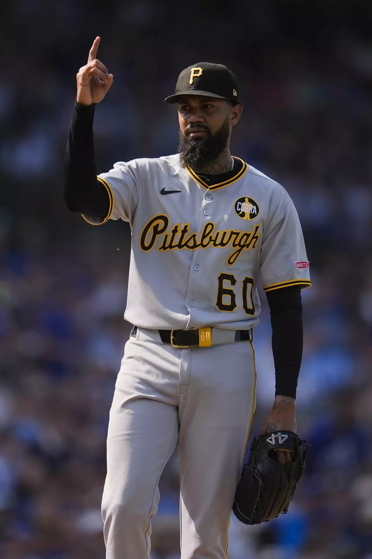 Pittsburgh Pirates pitcher Dennis Santana reacts to his team's win over the Chicago Cubs in a baseball game Friday, Aug. 15, 2025, in Chicago. (AP Photo/Erin Hooley)