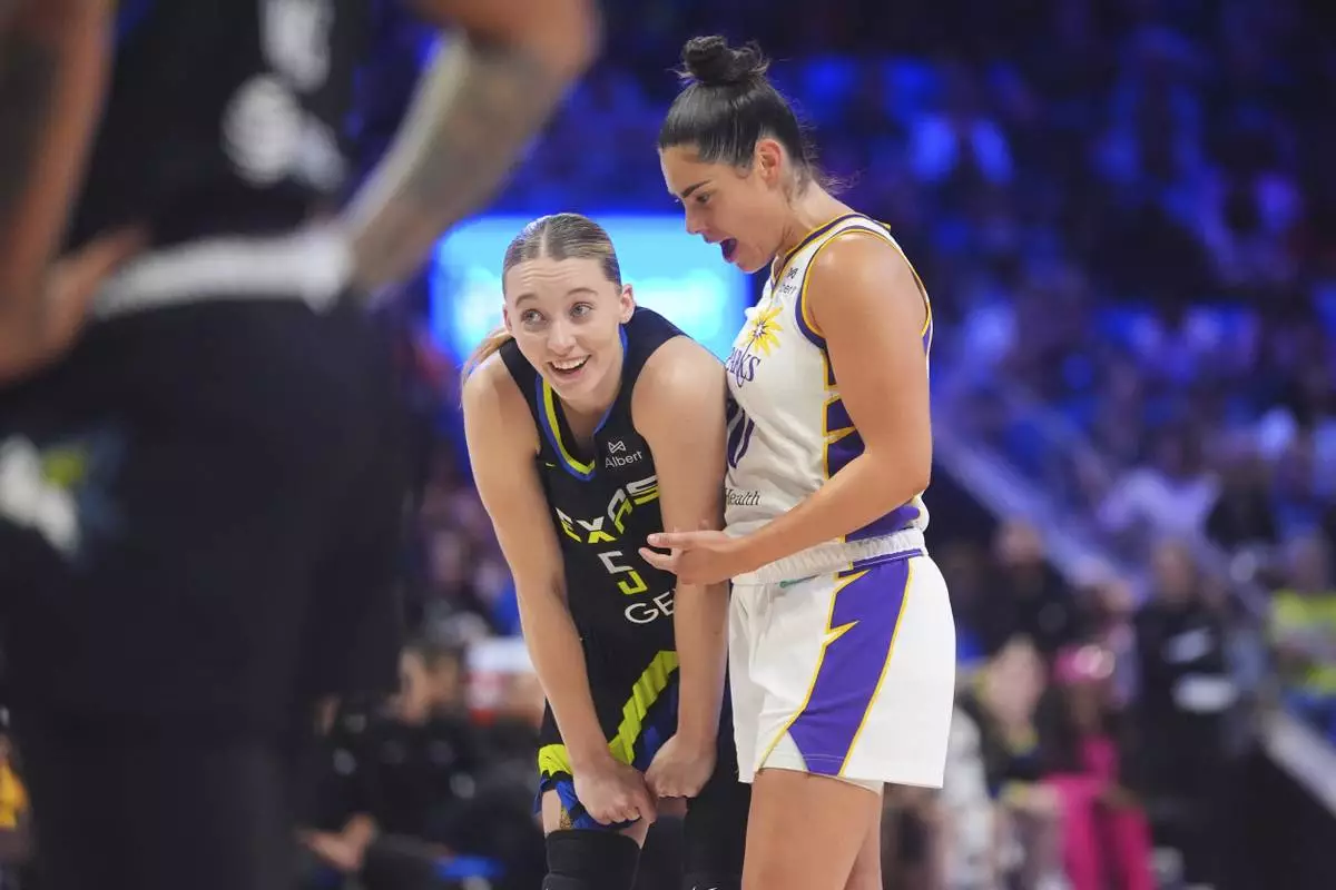 Los Angeles Sparks guard Kelsey Plum, right, talks to Dallas Wings guard Paige Bueckers (5) during the second half of a WNBA basketball game in Arlington, Texas, Friday, Aug. 15, 2025. (AP Photo/LM Otero)