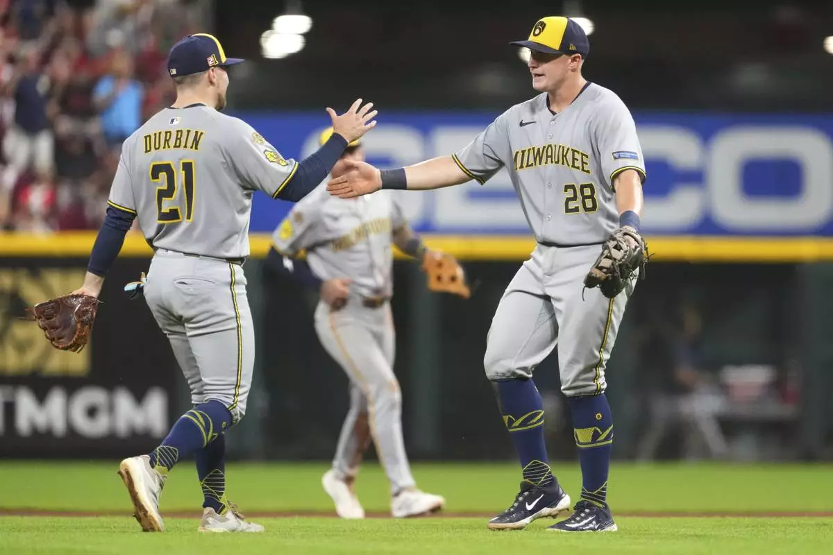 Milwaukee Brewers' Caleb Durbin, left, and Milwaukee Brewers' Andrew Vaughn, right, celebrate their win at the conclusion of the ninth inning of a baseball game against the Cincinnati Reds, Friday, Aug. 15, 2025, in Cincinnati. (AP Photo/Kareem Elgazzar)