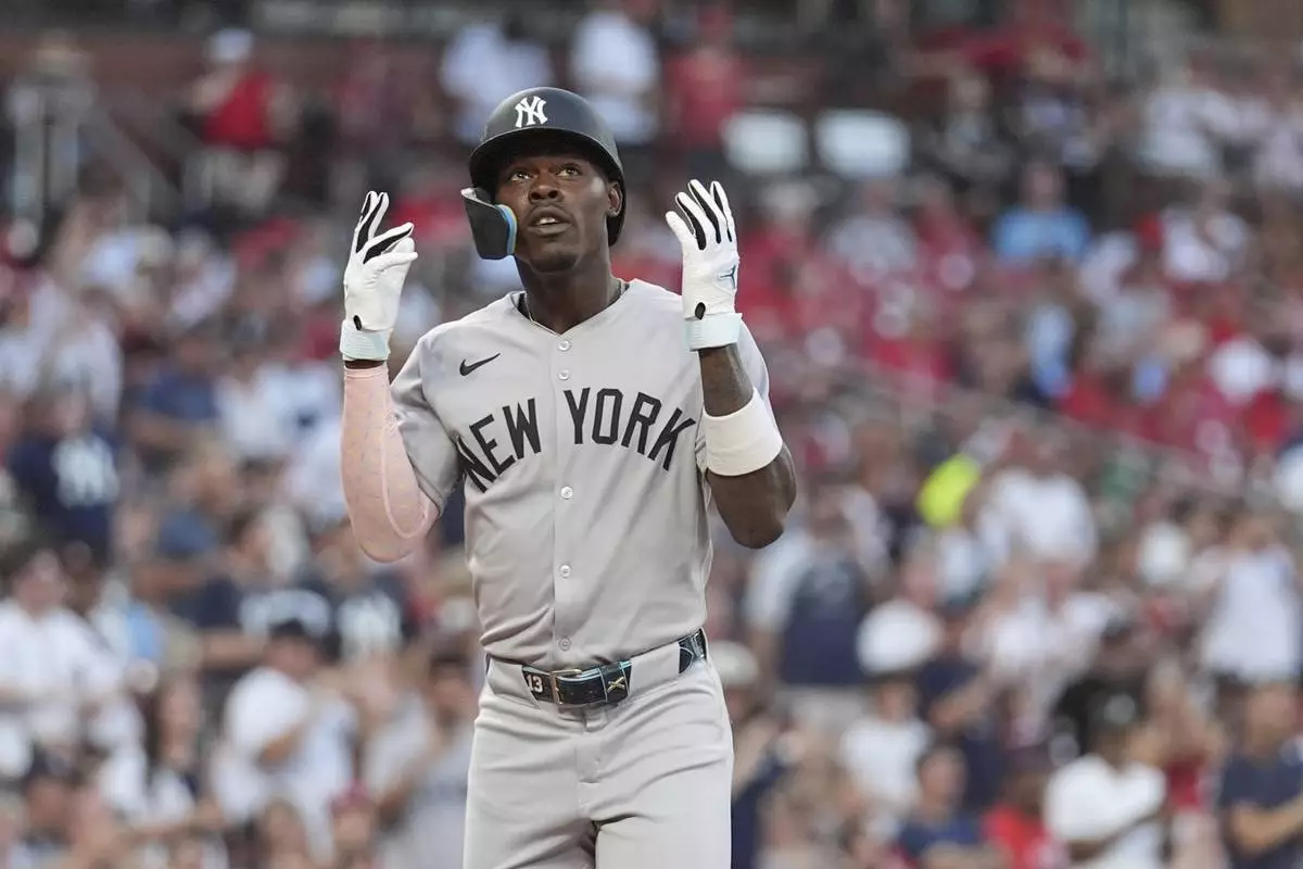 New York Yankees' Jazz Chisholm Jr. arrives home after hitting a two-run home run during the first inning of a baseball game against the St. Louis Cardinals Friday, Aug. 15, 2025, in St. Louis. (AP Photo/Jeff Roberson)